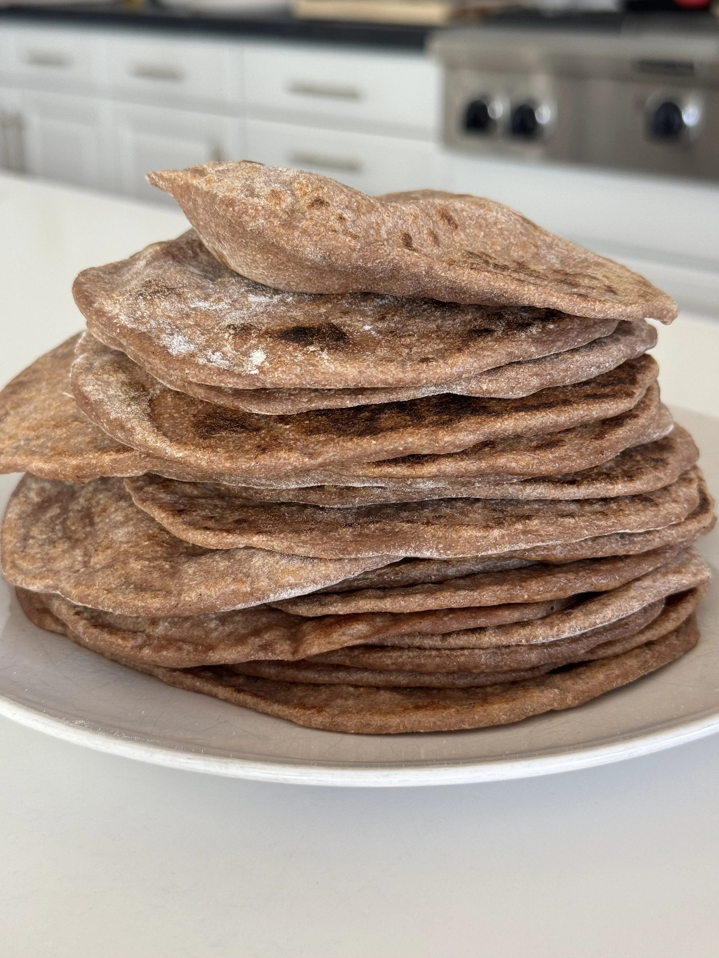 Every month, I make about 20 wholewheat flat breads to freeze. I add psyllium husk and gluten for extra fiber and softness.